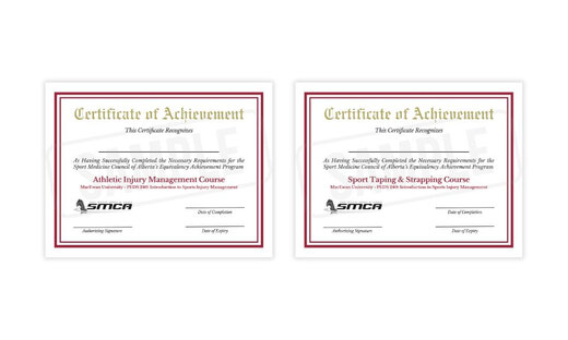 Students enrolled in physical education or kinesiology programs at post-secondary institutions can earn a Certificate of Achievement in Athletic Injury Management and Sport Taping & Strapping by completing recognized courses. The MacEwan University PEDS 240 Course is currently recognized by the SMCA and is eligible to receive certificates of achievement.