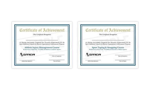 Students enrolled in physical education or kinesiology programs at post-secondary institutions can earn a Certificate of Achievement in Athletic Injury Management and Sport Taping & Strapping by completing recognized courses. The Northwestern Polytechnic PE 2400 Course is currently recognized by the SMCA and is eligible to receive certificates of achievement.
